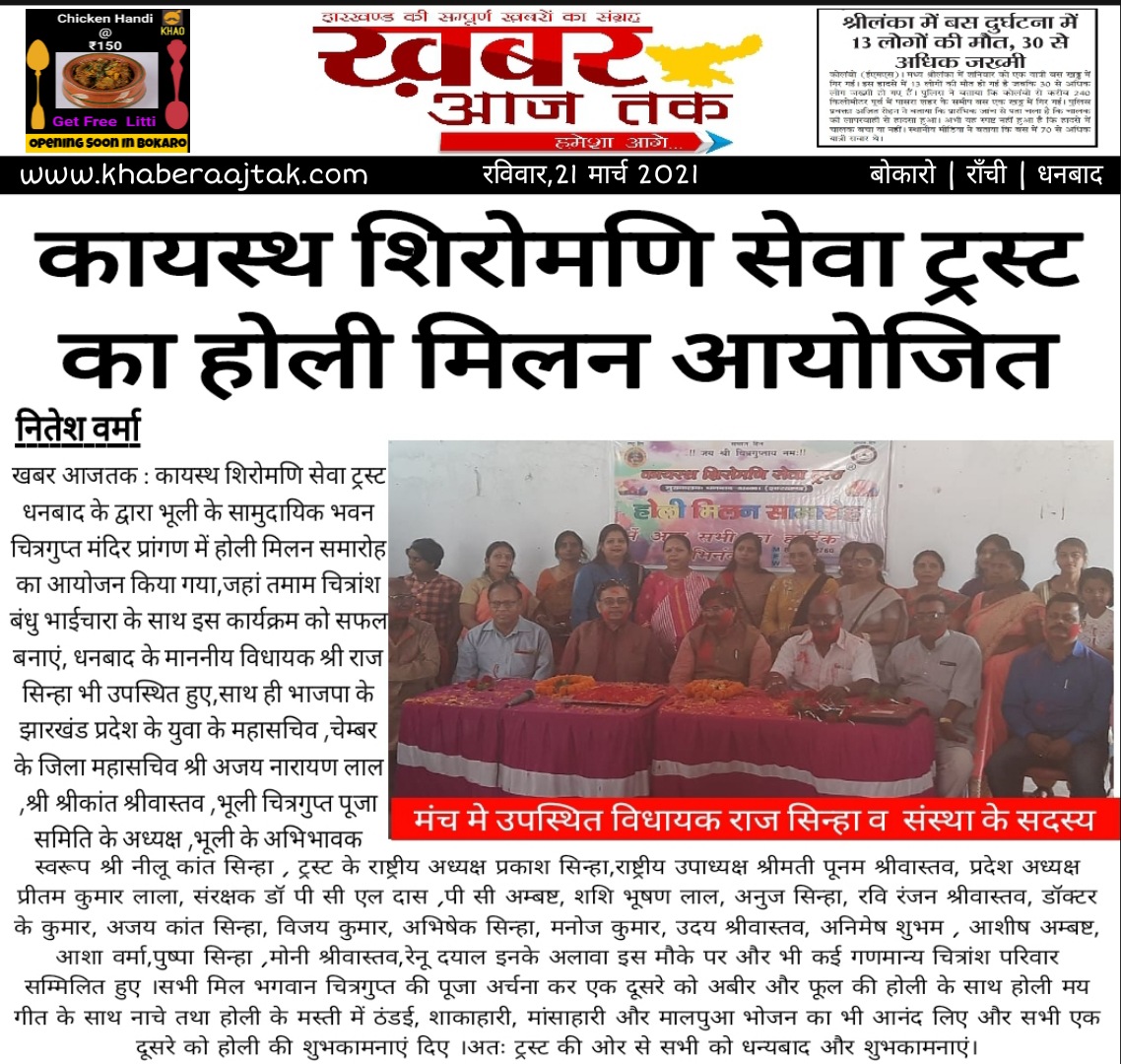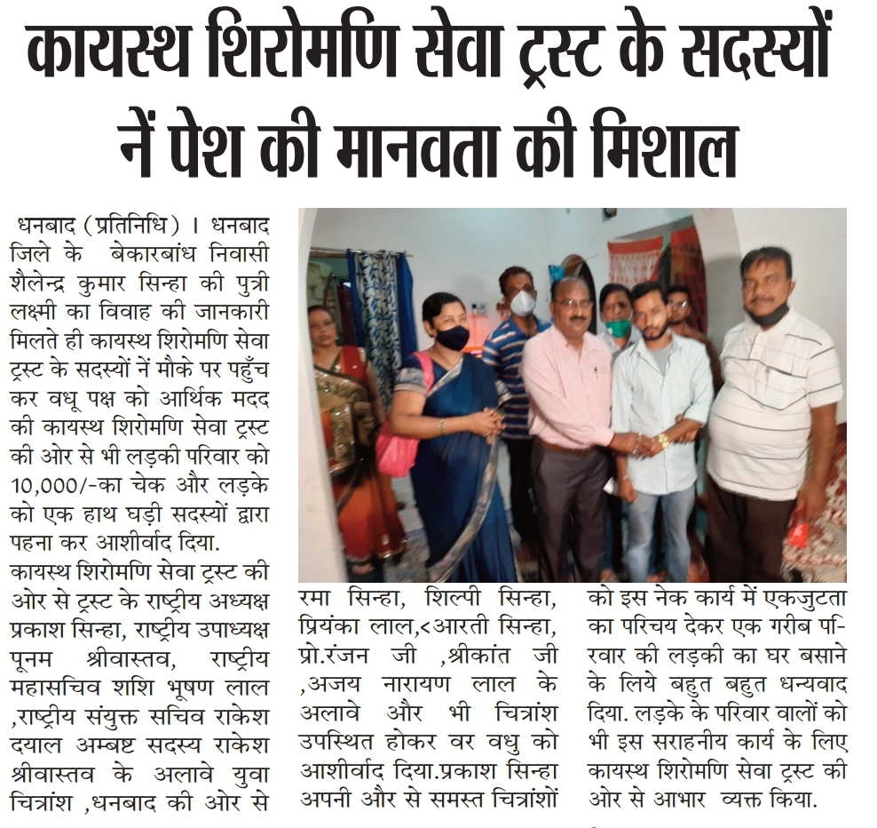 कायस्थ शिरोमणि सेवा ट्रस्ट कि शुरुवात दिनांक 07.07.2019 को कायस्थ शिरोमणि सेवा संघ के नाम से हुई थी जो 30.10.2019 को कायस्थ शिरोमणि सेवा ट्रस्ट के नाम से रजिस्टर्ड हुई। कायस्थ शिरोमणि सेवा ट्रस्ट श्री प्रकाश कुमार सिन्हा (ट्रस्ट के संस्थापक सह राष्ट्रीय अध्यक्ष) की पहल है। यह ट्रस्ट जन कल्यान, हमारे समाज के कल्याण लिये बनाया गया है। हमारा उद्देश्य है: मानव प्रयास के सभी क्षेत्रों में विकास एवं संवर्घन का प्रयत्न कर लक्ष्य की व्यापकता से, बिना किसी द्वेष के:-