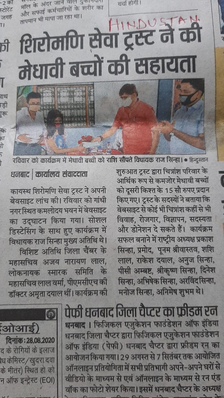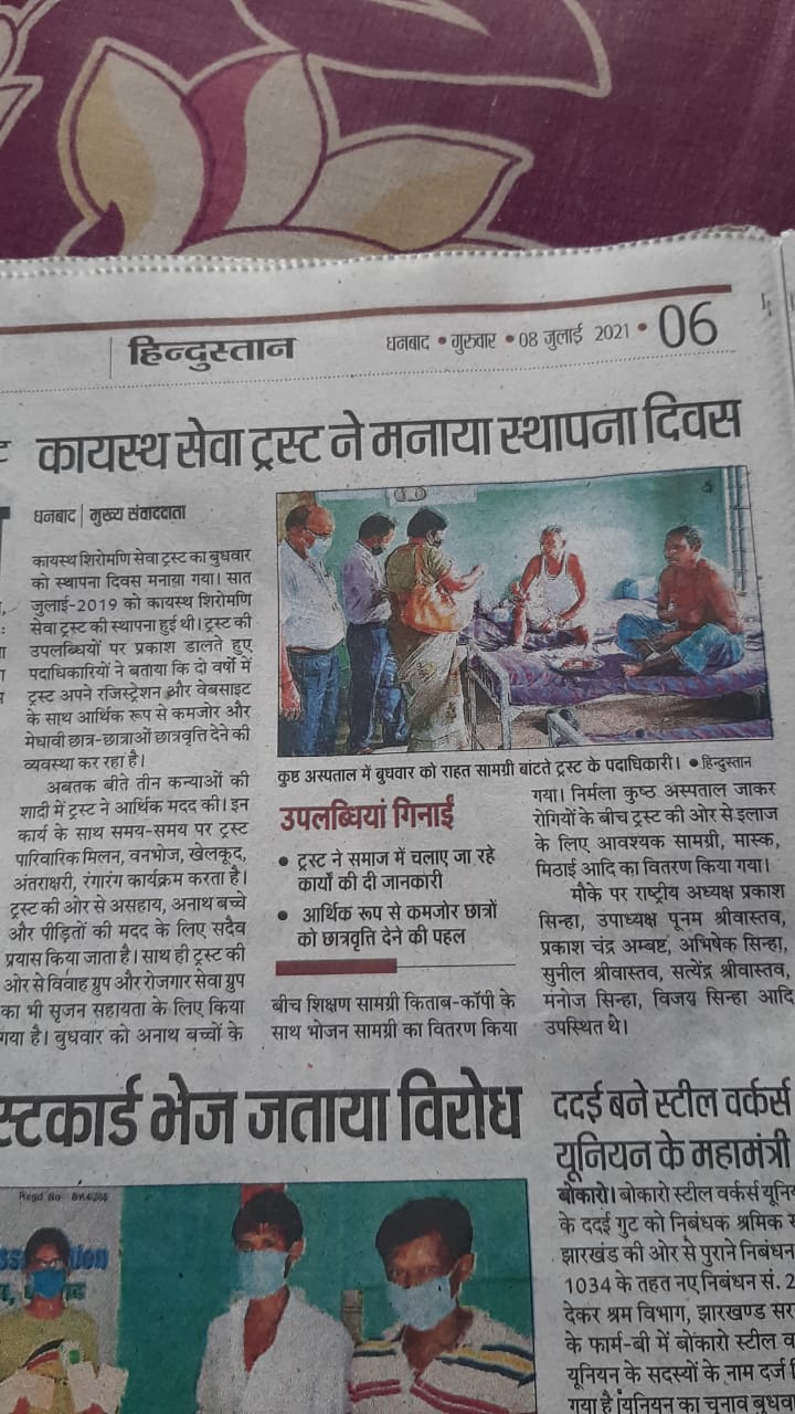 कायस्थ शिरोमणि सेवा ट्रस्ट कि शुरुवात दिनांक 07.07.2019 को कायस्थ शिरोमणि सेवा संघ के नाम से हुई थी जो 30.10.2019 को कायस्थ शिरोमणि सेवा ट्रस्ट के नाम से रजिस्टर्ड हुई। कायस्थ शिरोमणि सेवा ट्रस्ट श्री प्रकाश कुमार सिन्हा (ट्रस्ट के संस्थापक सह राष्ट्रीय अध्यक्ष) की पहल है। यह ट्रस्ट जन कल्यान, हमारे समाज के कल्याण लिये बनाया गया है। हमारा उद्देश्य है: मानव प्रयास के सभी क्षेत्रों में विकास एवं संवर्घन का प्रयत्न कर लक्ष्य की व्यापकता से, बिना किसी द्वेष के:-