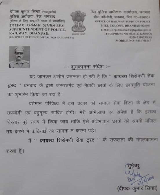 "कायस्थ शिरोमणि सेवा ट्रस्ट" धनबाद को मेरी ओर से सदैव शुभकामनाएँ। ट्रस्ट की ओर से जो भी कार्य समाज के हित में हो रहा है, जैसे: मेधावी और आर्थिक रूप से कमजोर छात्रों को छात्रवृत्ति देना, गरीब परिवार की कन्याओं और विधवा विवाह पर आर्थिक सहायता करना, महिलाओं और बच्चों का कार्यक्रम बीच-बीच में करते रहना, जो सदैव चल रहा है। इन सभी कार्यों को देखते हुए ट्रस्ट अपने मुकाम की ओर आगे बढ़ता जा रहा है। तथा आप सभी चित्रांशों से अनुरोध है की सहयोग दें। धन्यवाद।